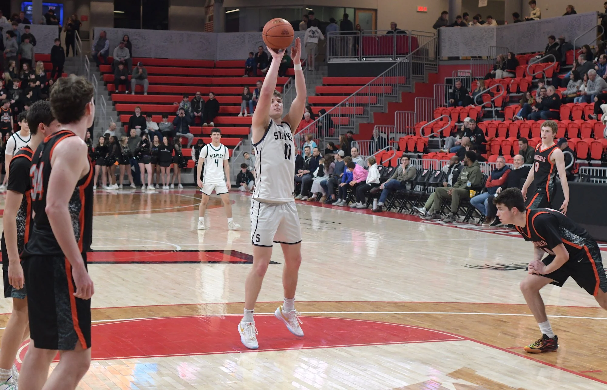Staples would respond with 2 more quick layups by Heyer, and a fundamental pump-fake followed by a layup by Wrecker sophomore Henry Veissid (5 points, 1 assist). Genova would continue his individual tear in the second quarter by drilling this third three in row past the red college three-point line to make the score 27-25 in favor of Staples at the half.