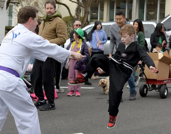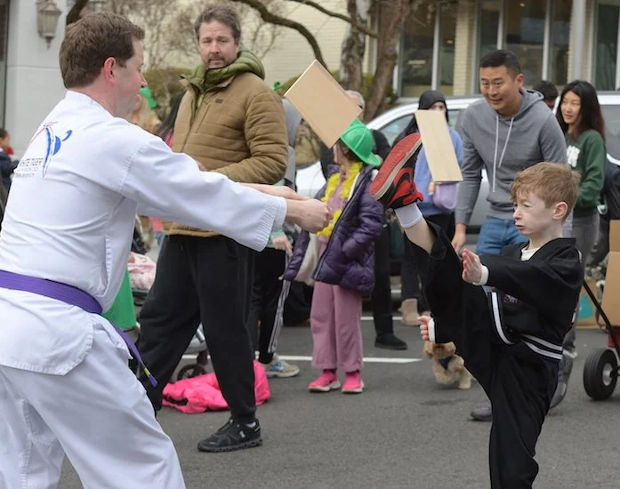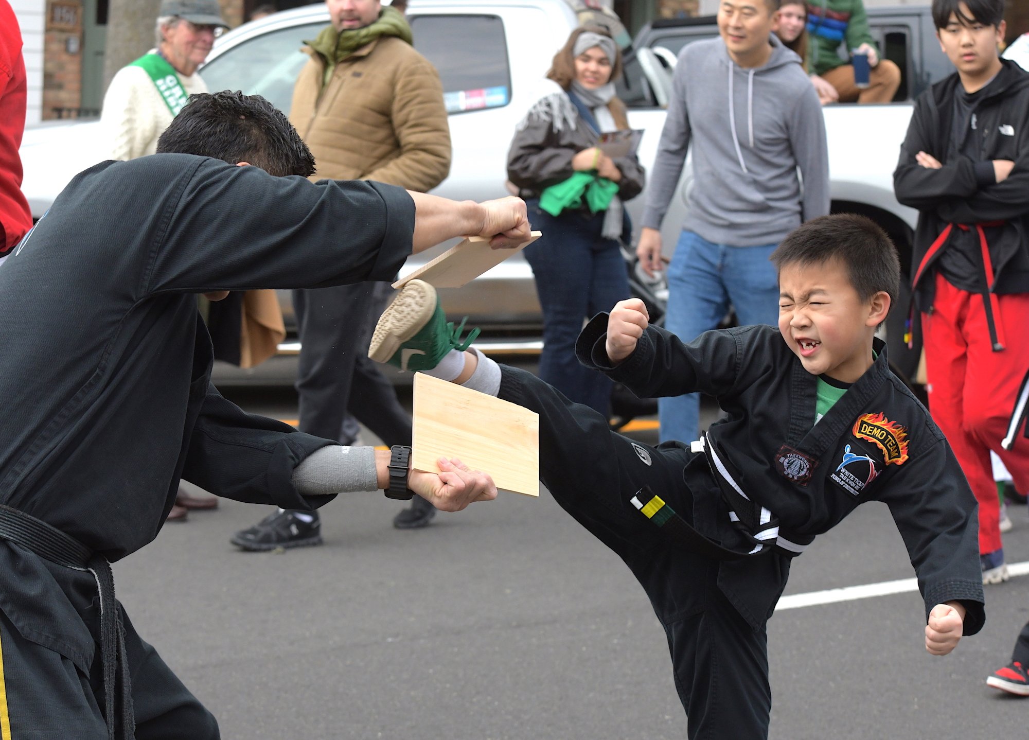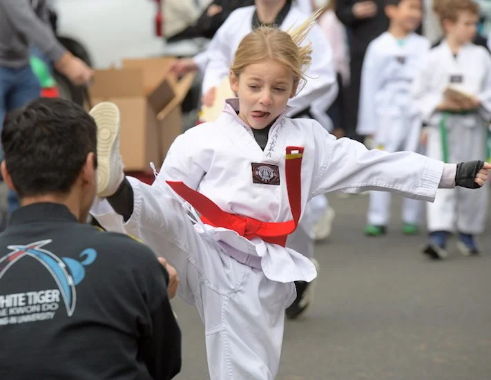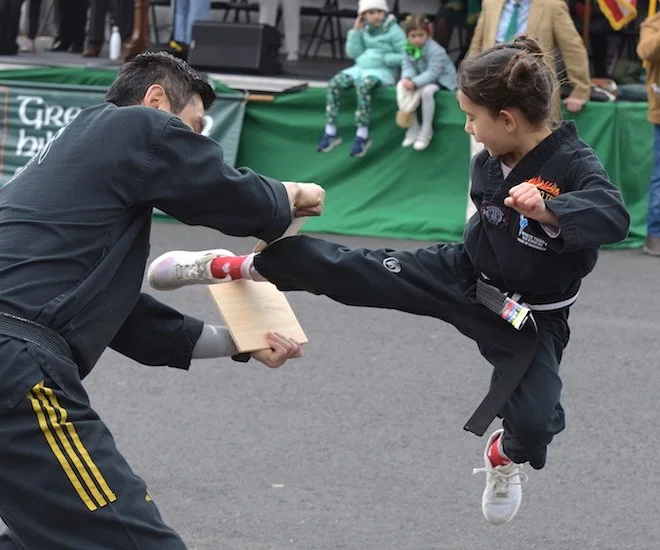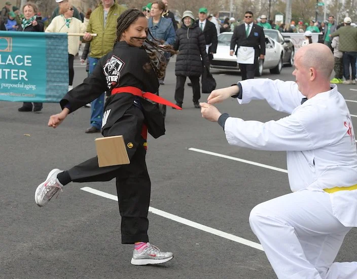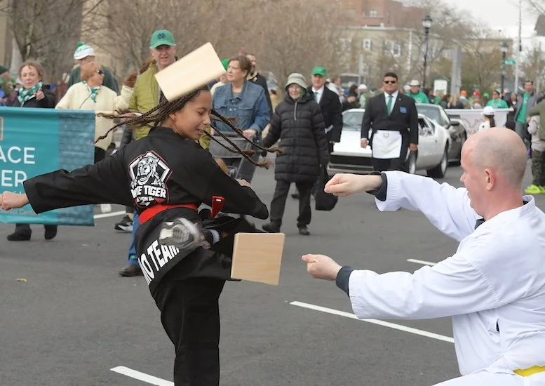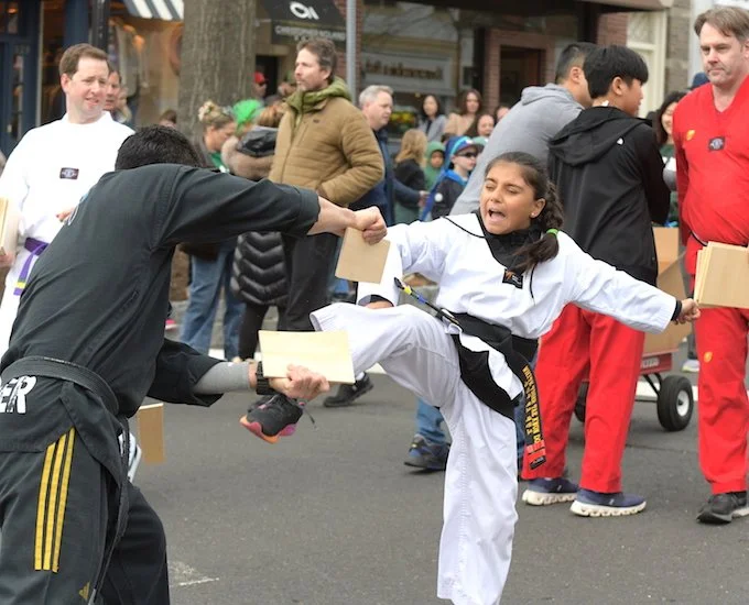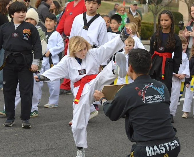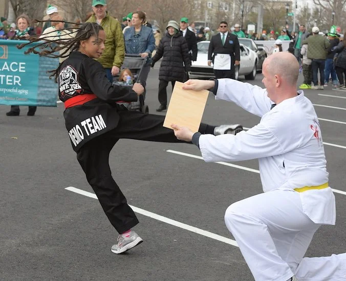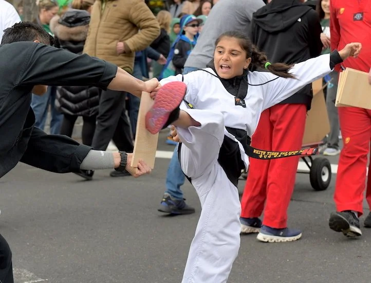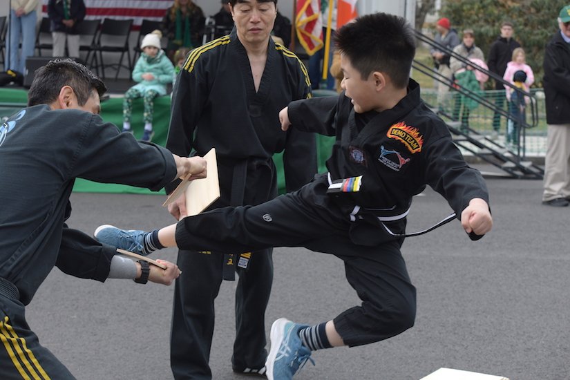 Students of the demonstration team of the dojo White Tiger Tae Kwan Do enthusiastically showed their training skills all along the parade route.