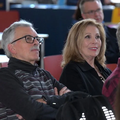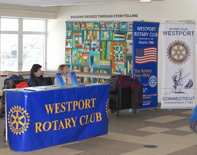Above, Westport Rotary volunteers gathered questions from the audience, which also included (at right) Cynthia and Carl Muller, Gloria Gourveia (sunglasses) and former RTM member Sal Liccione (black cap).