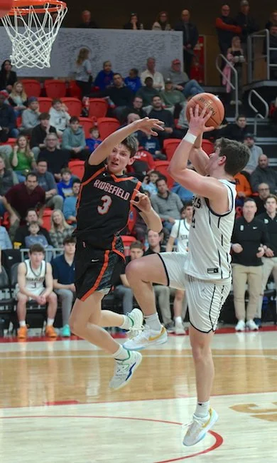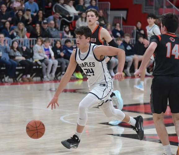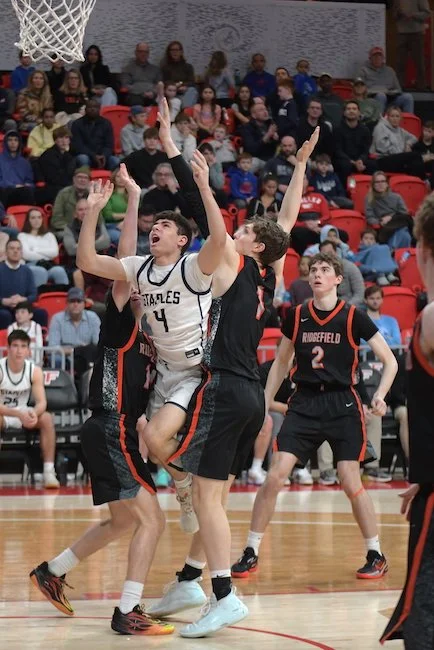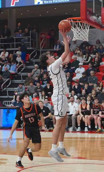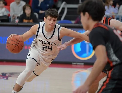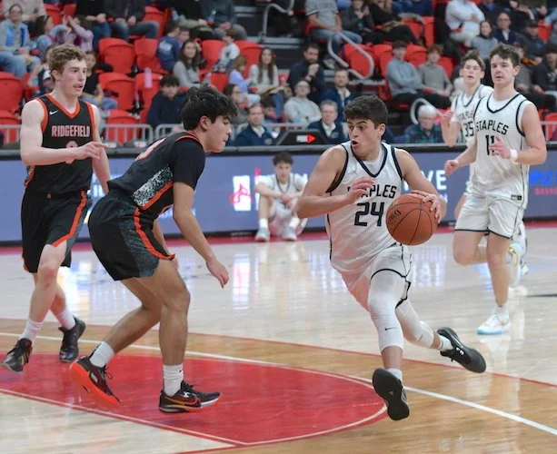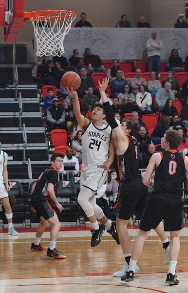 Ridgefield started off the second quarter with 2 quick baskets, one by senior Jacob Hankla (3 points, 4 rebounds) and another by Genova. Staples responded with a nice drive and dish from Heyer to senior Mason Tobias (14 points, 4 rebounds, 4 assists). A couple baskets by Tiger senior Jack Winstanley (10 points, 4 rebounds) and a very deep three by Genova made the score 22-18 Staples with under 3 minutes to go before the half.
