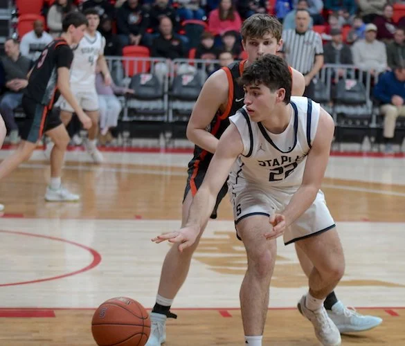 Staples would then extend their lead to 11-3 after senior Sam Clachko (13 points, 7 rebounds, 4 assists) rifled a pass from the left wing to the opposite corner to connect with junior Dhilan Lowman (7 points, 1 rebound, 1 assist) for a three. The first quarter concluded with yet another Clachko layup to make the score 16-7.