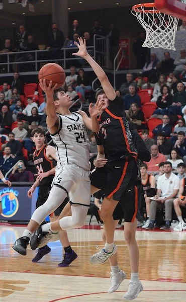 The second half got underway with a made free throw by Tobias and a layup on the other end by Winstanley. Staples senior Matty Corrigan (11 points, 4 rebounds, 2 steals) displayed his versatility in the third quarter, scoring 6 points in a row off of made free throws, a made three-pointer, and a strong contested layup in the paint. Genova then responded with an and-one layup to make the score 39-35 Staples with just over 3 minutes to go in the third quarter.